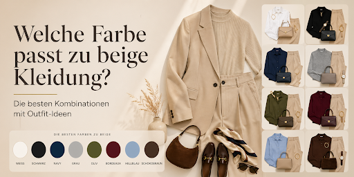 Zu beiger Kleidung passen besonders zuverlässig Weiß oder Off-White, Navy (Dunkelblau), Grau und Schwarz. Diese vier funktionieren, weil sie einen klaren Kontrast setzen, ohne Beige „schmutzig“ wirken zu lassen. Wenn du es wärmer magst, sind Oliv, Schokobraun und Bordeaux sehr sichere Partner, weil sie Beige erdiger und hochwertiger aussehen lassen. Für einen frischen, leichten Look funktionieren Hellblau und zarte Pastelltöne, vor allem im Frühling und Sommer.